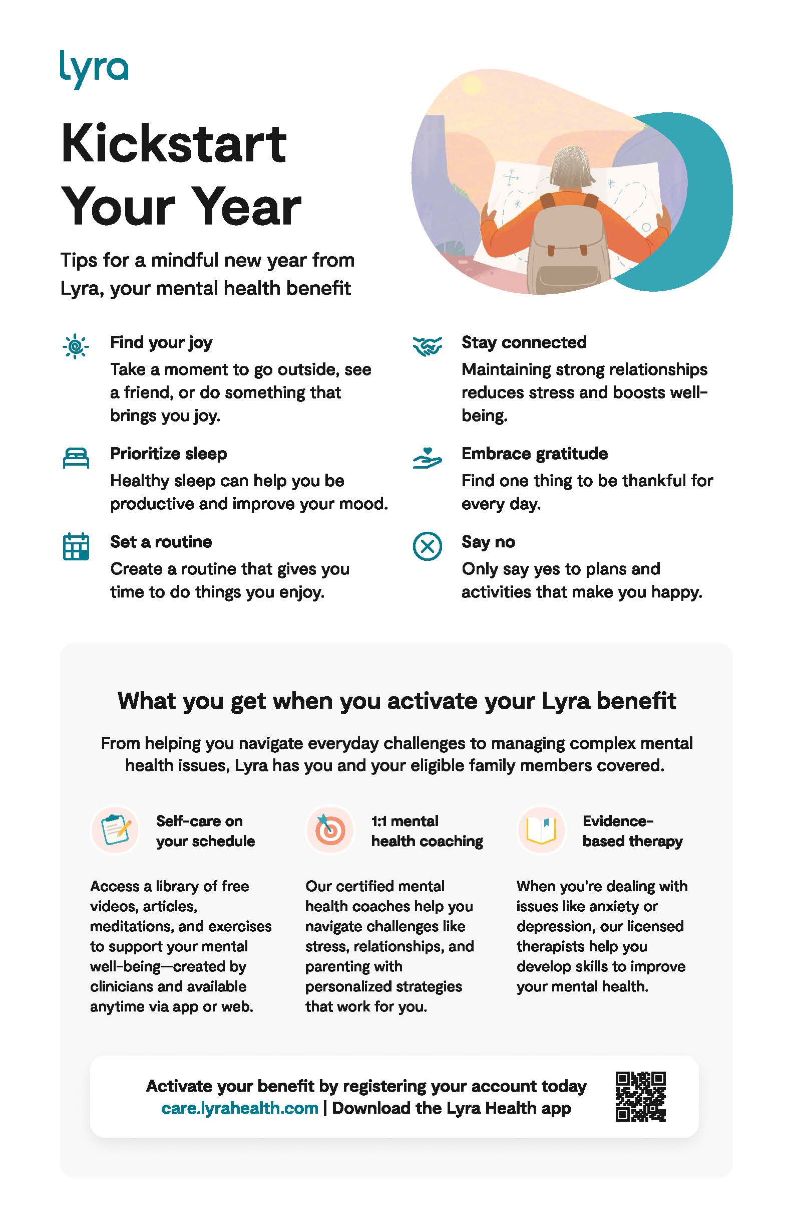 January can be a time to think about your health goals for the new year. Mental health is health. For tips from our Employee Assistance Program, Lyra Health, and to see what Lyra can offer you and your family, see the following flyer: Lyra New Year